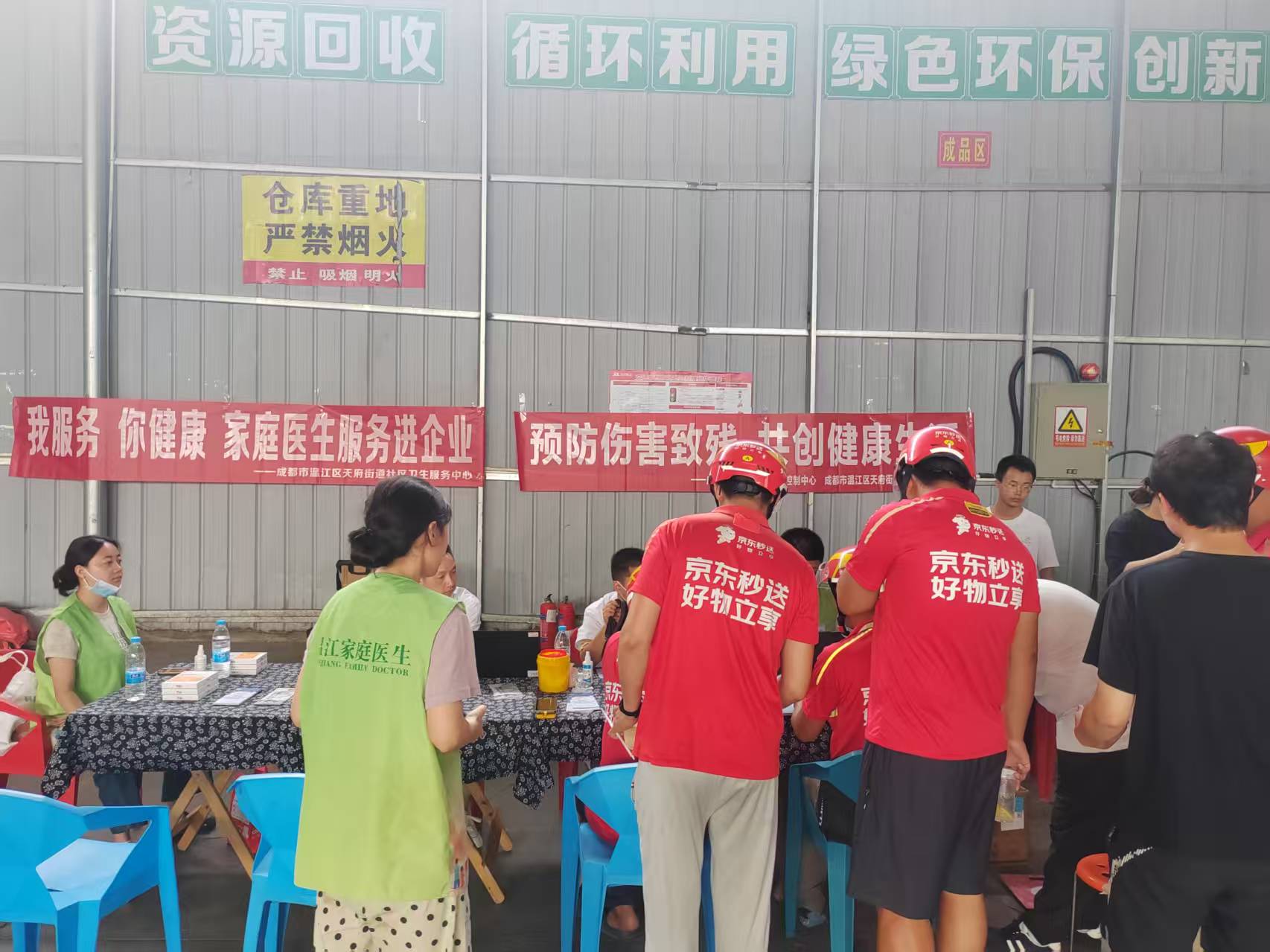 8月27日,成都市温江区天府街道社区卫生服务中心中心家庭医生团队携手温江区人民医院走进京东物流温江站点,为辛勤忙碌的“快递小哥”等新就业群体送去了一场温暖便捷的健康服务活动。