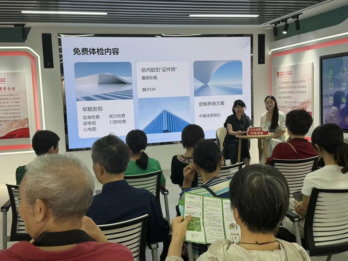 老年人体检是社区民生重点福利,为让老人易懂易记,周文雯主任用比喻解读体检项目:“血液检查 + 尿常规 + 心电图 = 早期发现慢病苗头”“腹部彩超 + 胸片 DR = 给内脏拍‘证件照’”“中医体质辨识 = 量身定制养生方案”。同时,现场公布体检报名途径,反复强调 “早发现、早治疗” 理念,引导老年人主动参与健康管理。