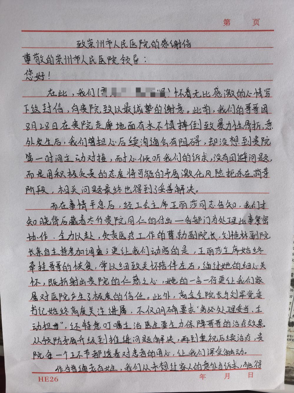 “作为普通老百姓,从没想过家人的意外和诉求,能得到医院的高度重视!”雷女士在信中表示,最初因哥哥在医院意外滑倒骨折而心怀愤懑,甚至做好了维权准备,担心医院会推诿责任。然而,崇州市人民医院的主动担当彻底扭转了这一局面——从院领导亲自督办调查、工会主席多次探望,到医护团队全力保障治疗,医院的每一份诚意都击碎了家属的疑虑。