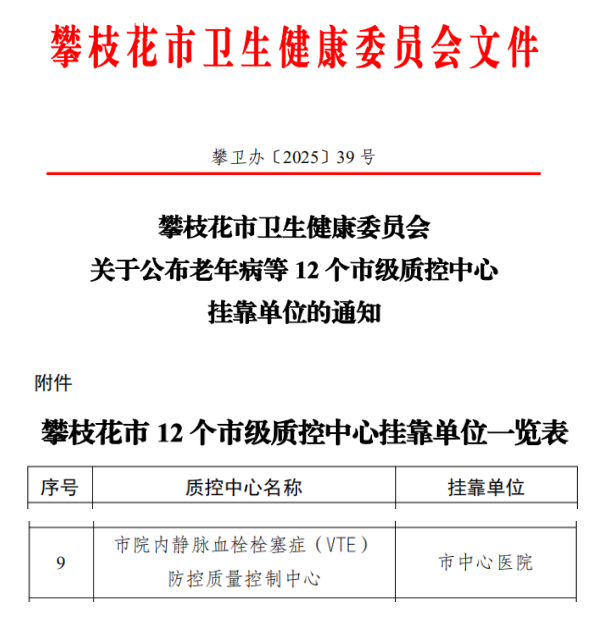 与此同时,攀枝花市卫生健康委员会正式确定医院为“市院内静脉血栓栓塞症(VTE)防控质量控制中心”挂靠单位。