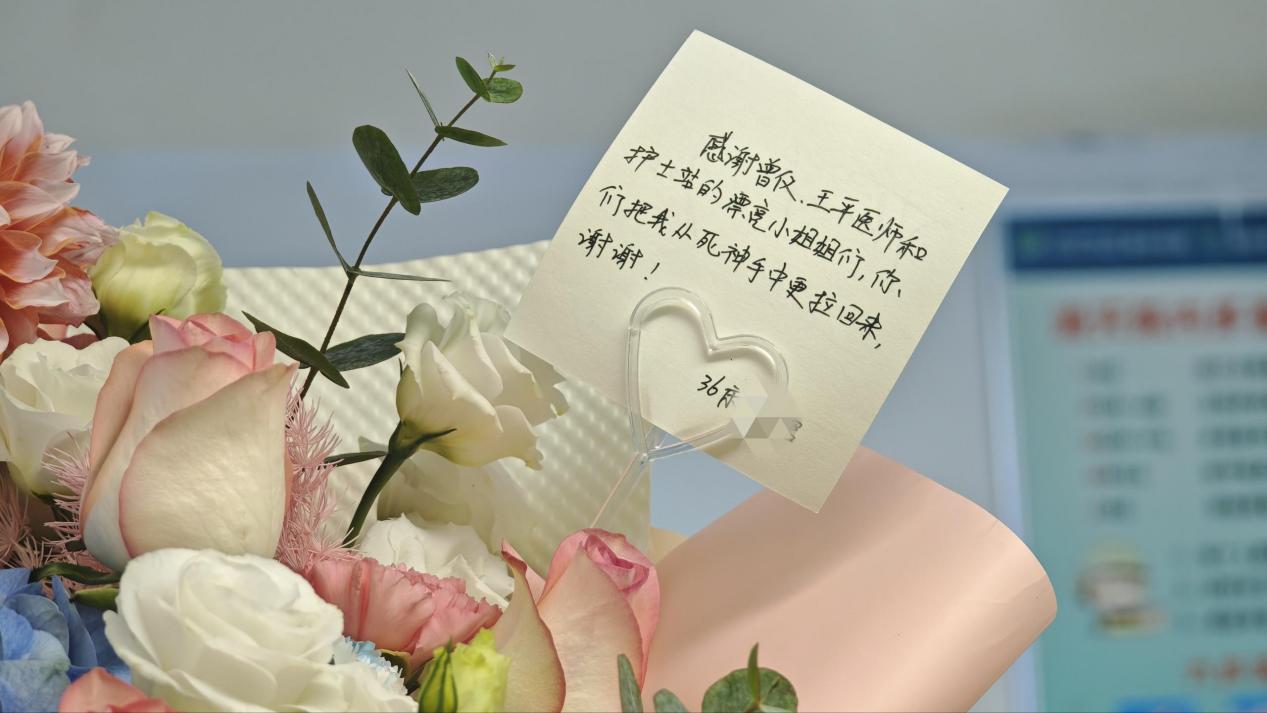 在医护团队的共同努力下,患者感染得到控制,休克成功逆转,逐渐康复顺利出院。临行前,患者和家属特意献上鲜花,患者在感谢信上写下:“是你们把我从死神手中拉了回来,谢谢。”( 王娇 安宁)