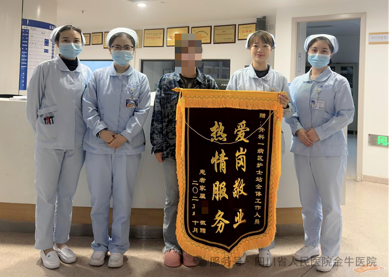在成都市金牛区人民医院骨科一病区,有一支践行“以患者为中心”理念的护士团队。作为医院人文护理试点病房,她们用专业的护理技术和暖心的关怀,为每一位患者撑起康复的希望。近日,这份坚守与付出收获了一份特别的认可—— 患者王大爷的家属专程送来一面锦旗,这也是该病区首面专门赠予护士团队的锦旗,见证着医患之间的深厚情谊。