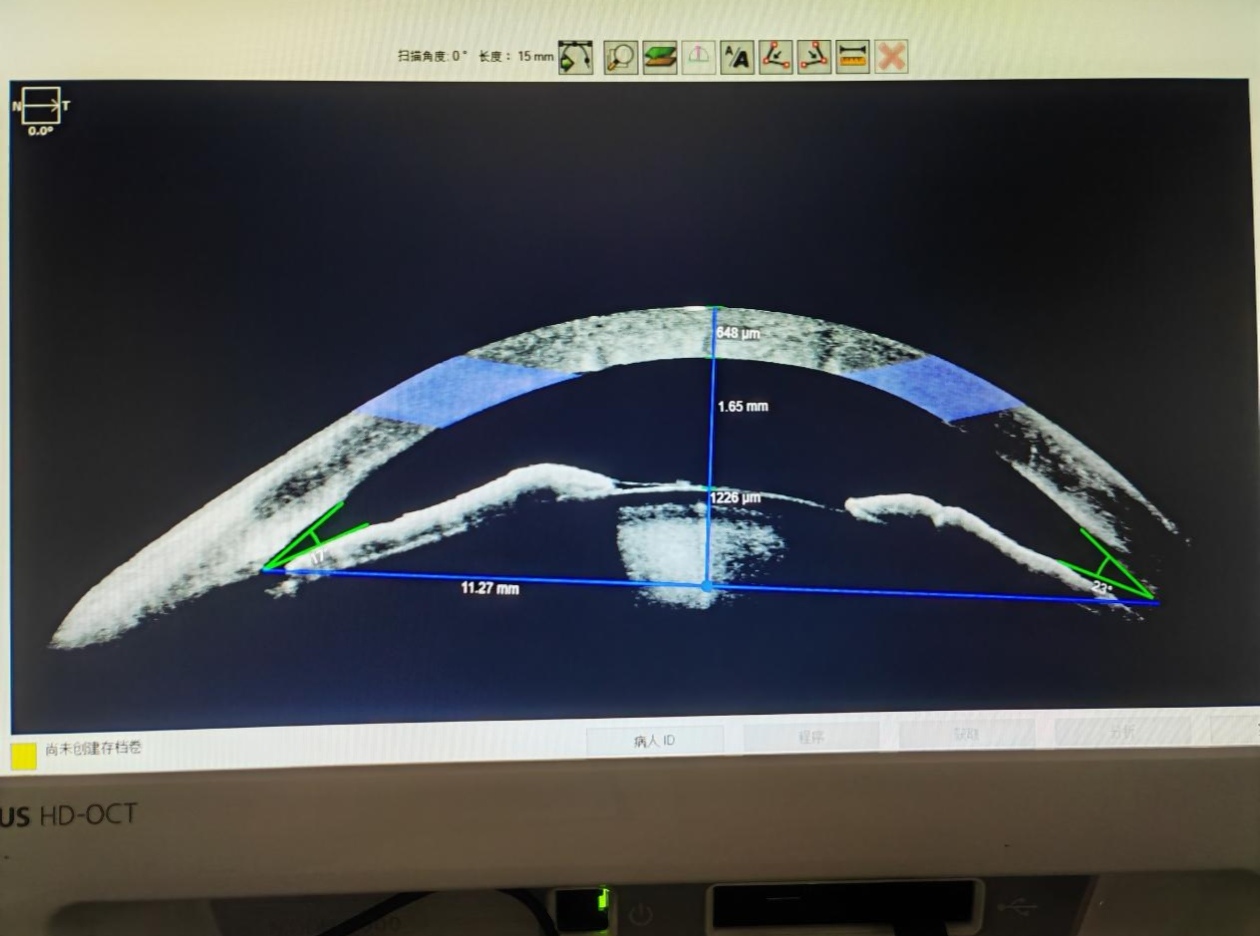 左眼术前前节OCT:左眼前房深度1.65mm(正常成年人为2.5—3.0mm)。(医院供图)
