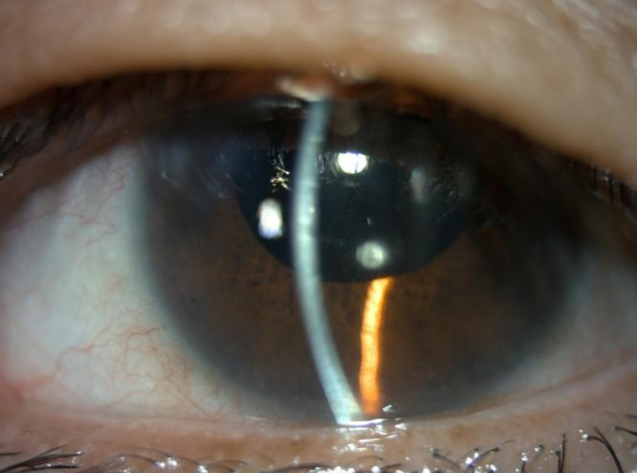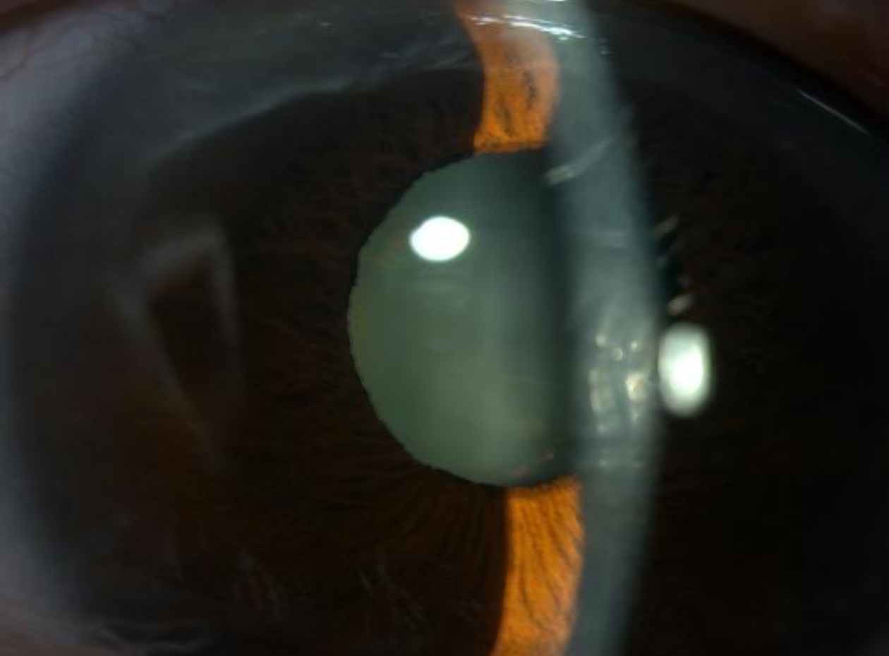 左眼术后前节照相:角膜无明显水肿、后弹力层稍显皱褶、前房深度可、周边虹膜平坦。(医院供图)
