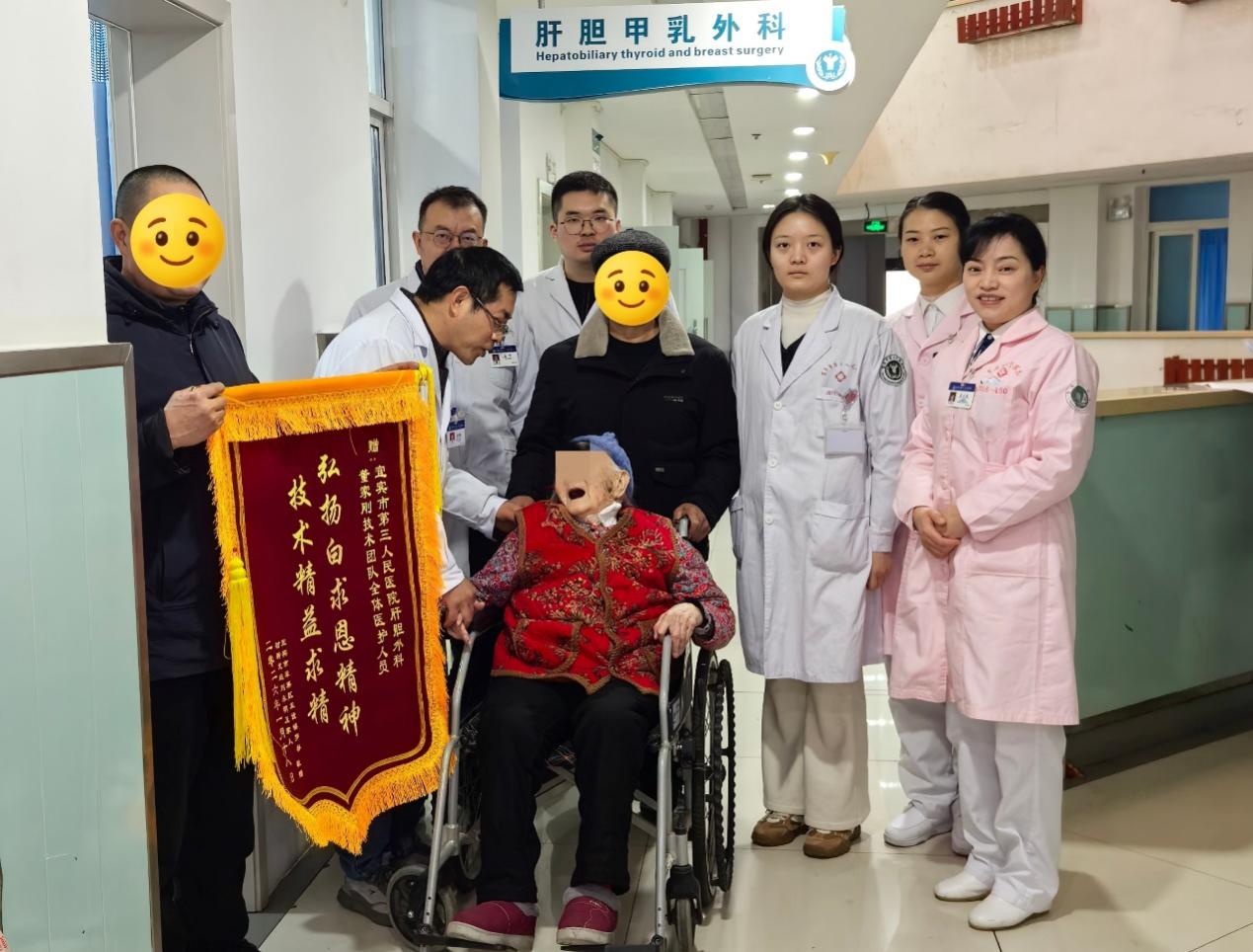 宜宾市第三人民医院肝胆外科,97岁的郭奶奶紧紧拉着医生的手。近日,她的家属将一面锦旗送到医护人员手中,感谢他们以精湛的医术、精心的护理和多学科紧密协作,帮助身患多种严重疾病的郭奶奶顺利渡过手术难关,并于术后4天康复出院。