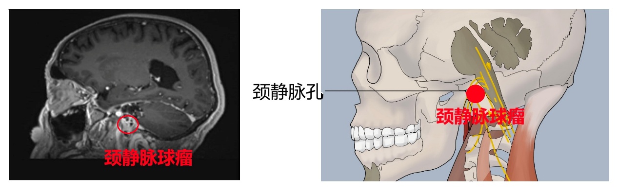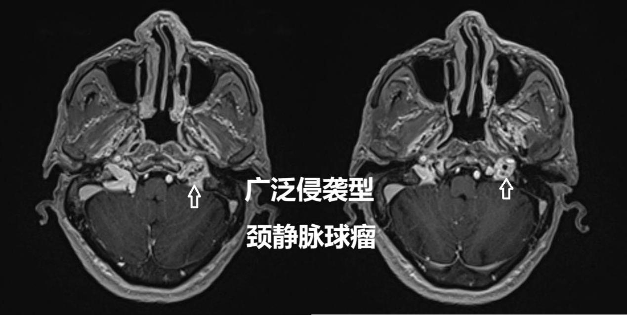66岁的林大爷在一年前突然出现左侧颈部牵扯性疼痛,并伴有头晕、头痛和眼睛胀痛。起初他以为只是劳累或休息不足,但症状持续未见缓解。随着时间推移,他还逐渐出现了吞咽呛咳、声音嘶哑等表现,严重时食物甚至会反流至鼻腔。林大爷在家人陪同下辗转于多家医院,接受了十余项检查,却始终未能得到诊治。最终,他来到我院就诊,经过头颅磁共振(MRI)、增强CT等系统检查,林大爷被确诊为颈静脉球瘤——一种发生于颅底深处的罕见血管性肿瘤。