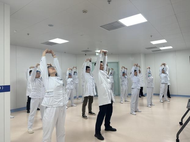 参与活动的医生护士们随着“两手托天理三焦,左右开弓似射雕”的口令柔和舒展。尽管只有十分钟,但专注地练习后,许多人脸上浮现出放松的神情。