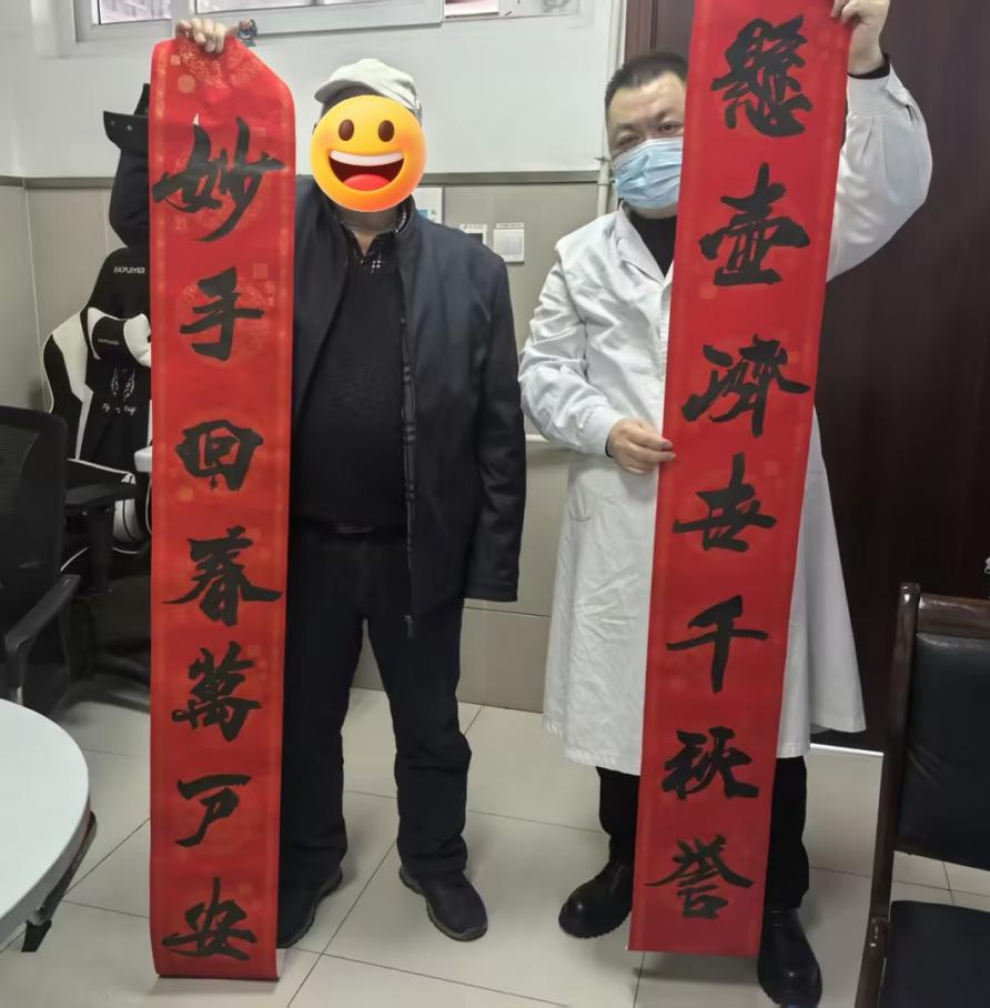“悬壶济世千秋誉,妙手回春万户安”,横批“医者仁心”。秦大爷激动地说:“纪主任,给您送副春联,这是我最近练字的成果。”纪主任双手接过,小心翼翼地将红纸展开,低头细看每一个字。墨迹虽不尽完美,却笔笔沉稳、字字用心。他抬起头,眼里带着笑意:“秦大爷,这副春联写得真好,一笔一画都是功夫。谢谢您这么用心,也谢谢您这份珍贵的年礼——这是今年中医科收到的最温暖、最有分量的礼物。”
