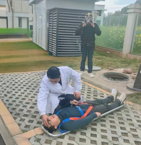 实战演练阶段,以“污水井作业人员因有害气体超标晕倒”为模拟场景,严格遵循“先通风、再检测、后作业”原则,规范开展器材检查、警戒划定、应急报警、防护施救、心肺复苏及复盘点评等流程,各小组分工明确、响应迅速,有效检验了应急预案的可操作性,提升了职工有限空间应急救援实战能力。
