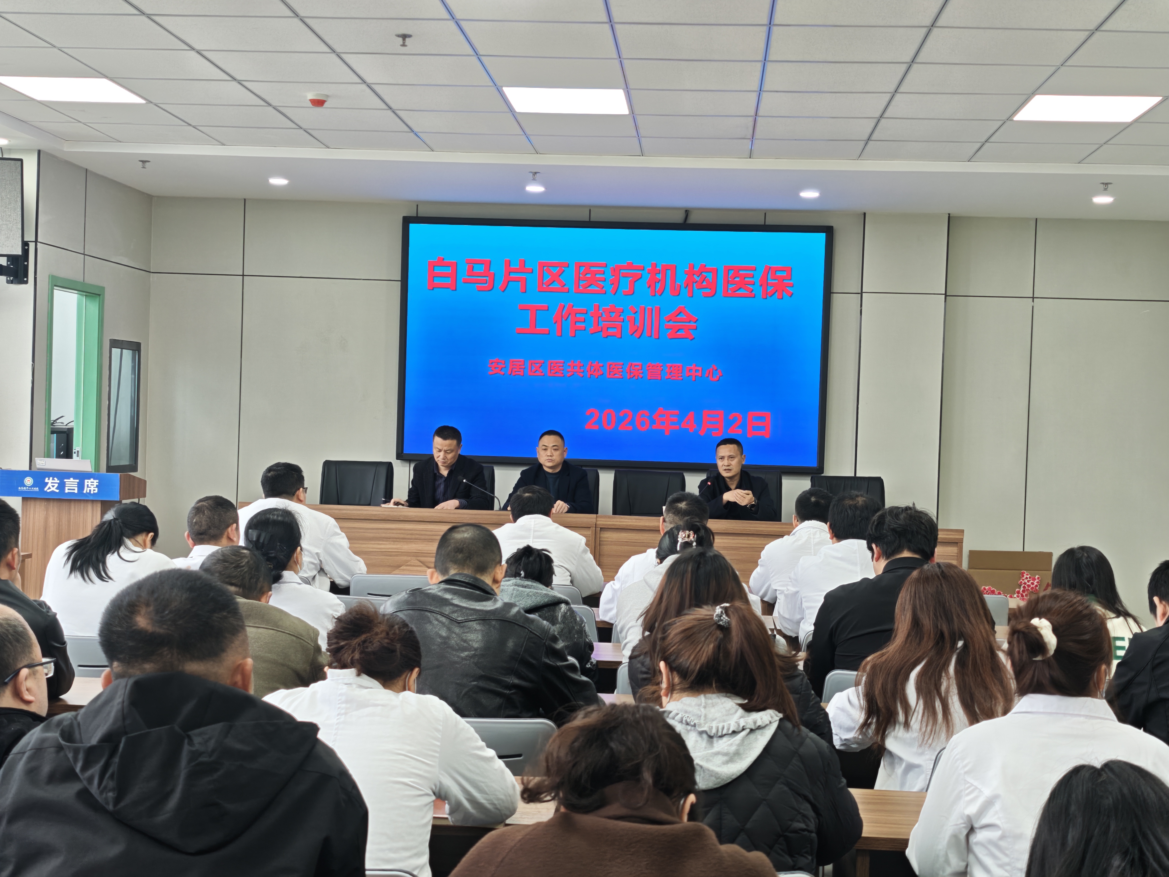 为了进一步规范医保基金使用行为,提升医保管理服务水平,切实守护医保基金安全,4月2日,遂宁安居区医共体医保管理中心在白马镇中心卫生院组织召开白马片区医疗机构医保工作培训会暨医保督导反馈会。片区各医疗机构医保工作负责人,以及白马镇中心卫生院医护技药、医保收费室等相关科室全员全程参会学习。