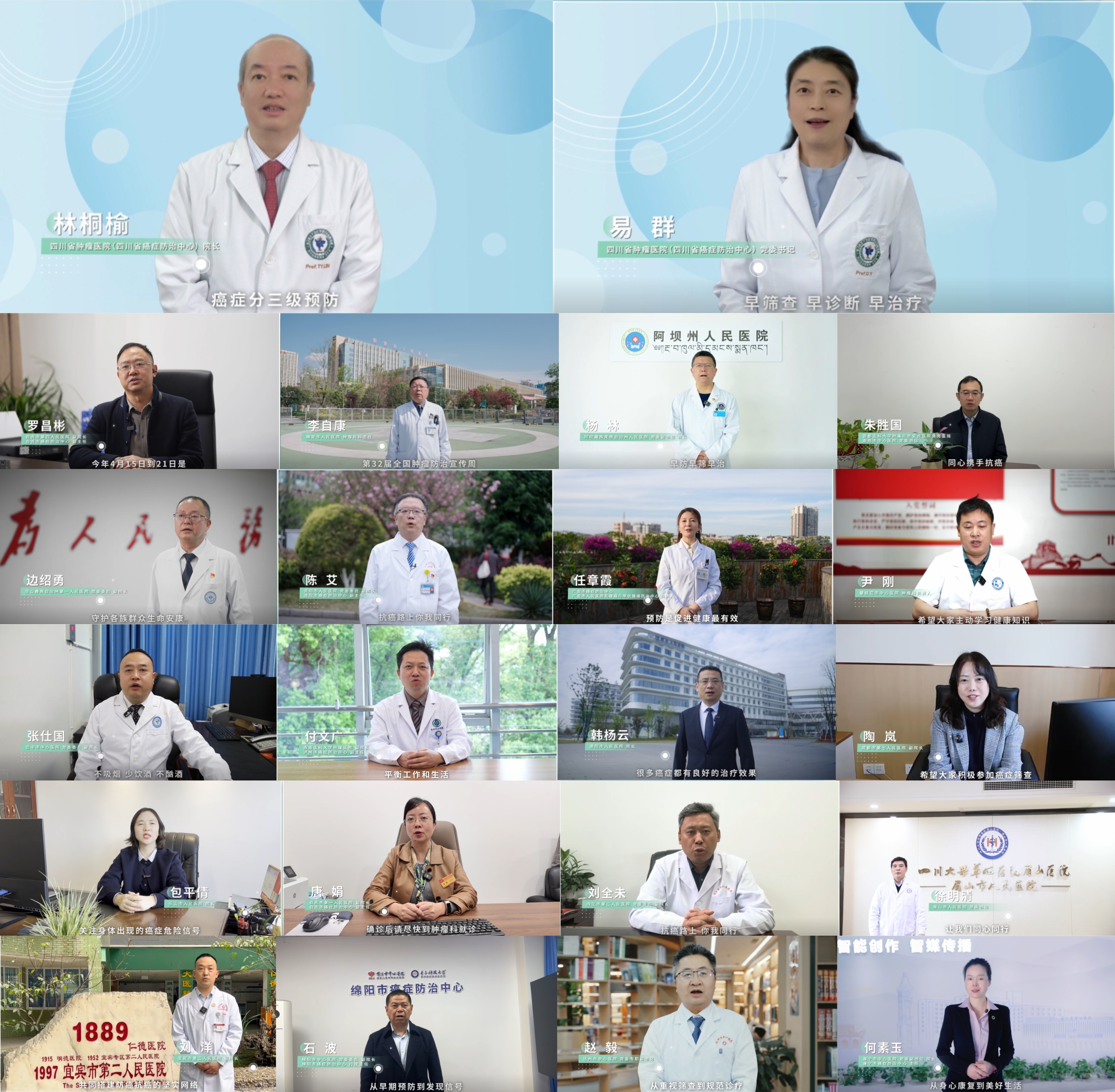 一声倡议,全川响应。在四川省癌症防治中心的带领下,全省21个市(州)癌症防治中心逐一发出宣传周主题倡议, 围绕“早防”、“早筛”、“早治”、“同心携手抗癌”等核心关键词表达地区声音,体现了全省上下“一盘棋”、齐心协力同抗癌的坚定决心。