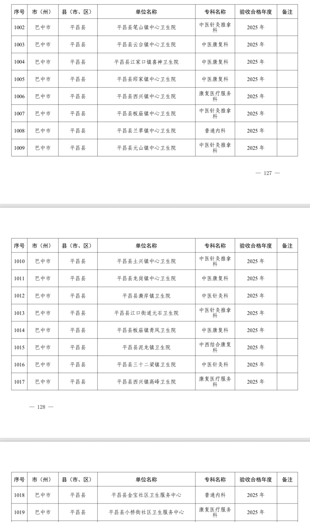 近日,四川省卫生健康委员会发文公布了2025年四川省基层临床特色科室名单,该评审经单位自评、县级评价、市级抽查等程序。巴中市平昌县笔山镇中心卫生院中医针灸推拿科、云台镇中心卫生院中医康复科、江家口镇喜神卫生院中医康复科、邱家镇中心卫生院中医康复科、西兴镇中心卫生院康复医疗服务科、板庙镇中心卫生院中医针灸推拿科、兰草镇中心卫生院普通内科、元山镇中心卫生院中医针灸推拿科、土兴镇中心卫生院中医针灸推拿科、龙岗镇中心卫生院中医康复科、澌岸镇卫生院中医针灸科、江口街道元石卫生院中医针灸推拿科、板庙镇青凤卫生院中医康复科、泥龙镇卫生院中西结合康复科、三十二梁镇卫生院中医针灸科、西兴镇高峰卫生院康复医疗服务科、金宝社区卫生服务中心普通内科、小桥街社区卫生服务中心康复医疗服务科共18个科室获评四川省基层临床特色科室。(苟魏芳)
